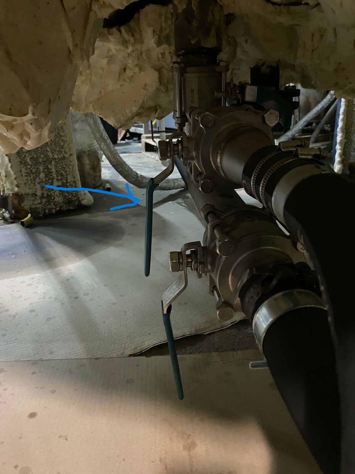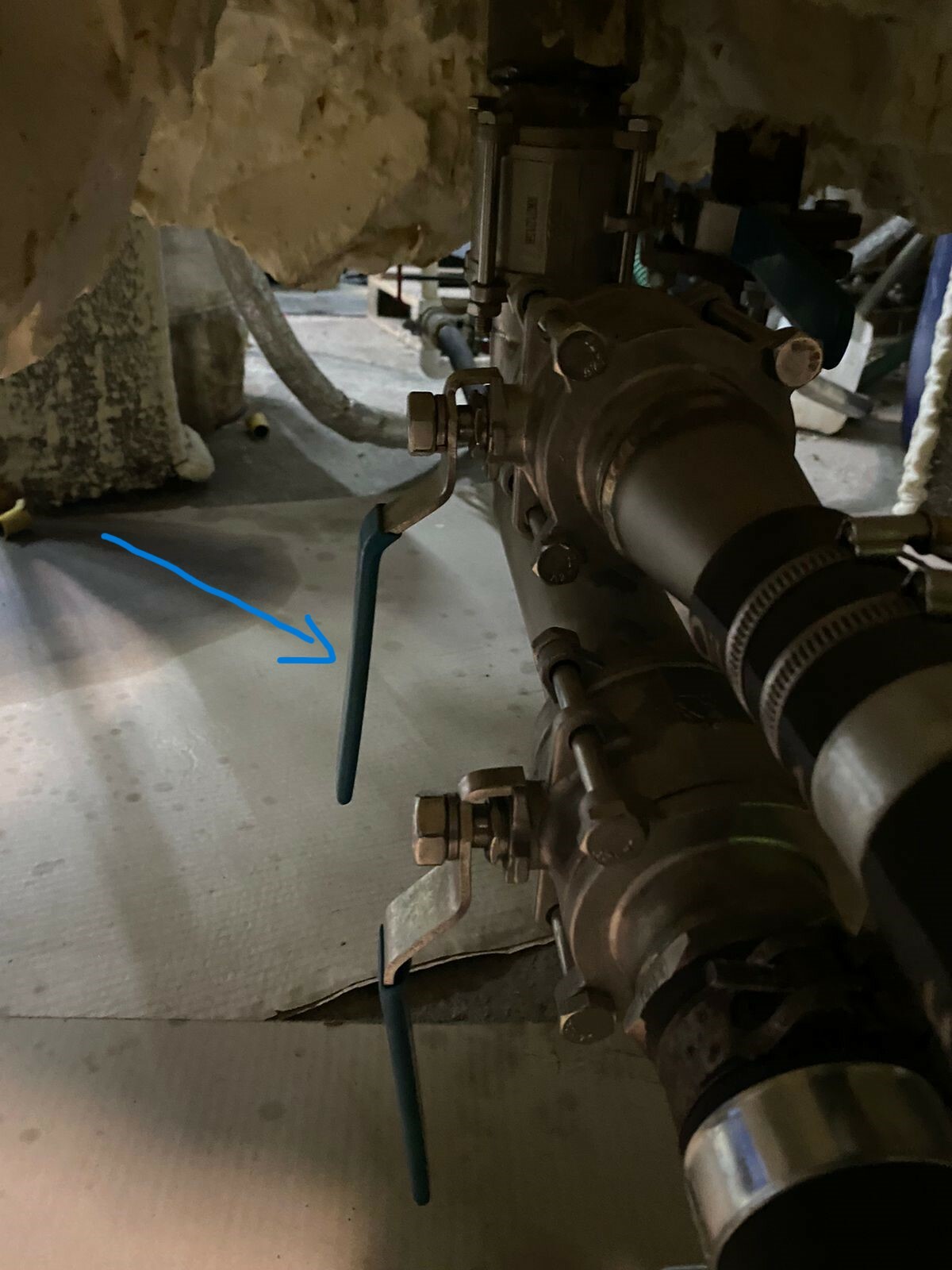 10). За 20 минут до пробы открываем воду (снизу дальний красный кран), затем открываем верхний черный кран.(ДАННАЯ ОПЕРАЦИЯ ВЫПОЛНЯЕТСЯ ЕСЛИ ТЕМПЕРАТУРА ПРОДУКЦИИ ПРЕВЫШАЕТ 92 ГРАДУСА.)